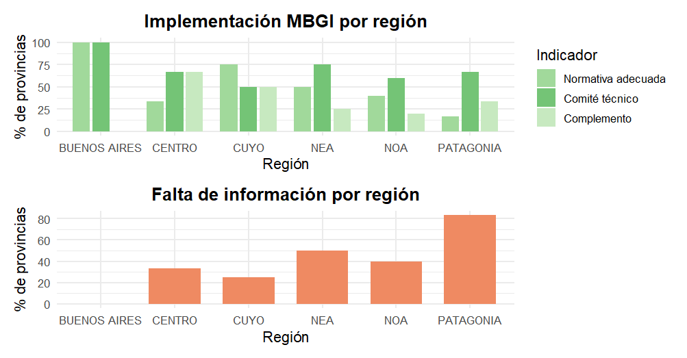 A nivel regional, las provincias de Cuyo presentan el mayor grado de adecuación normativa (75%), seguidas por NEA (50%) y NOA (40%), mientras que la Patagonia registra el nivel más bajo (16,7%) y concentra la mayor proporción de provincias sin información pública o actualizada (83,3%). Este panorama evidencia la necesidad de fortalecer el seguimiento interjurisdiccional, homogeneizar criterios y asegurar la transparencia de los procesos para avanzar hacia una implementación más equitativa y efectiva del MBGI en todo el país.