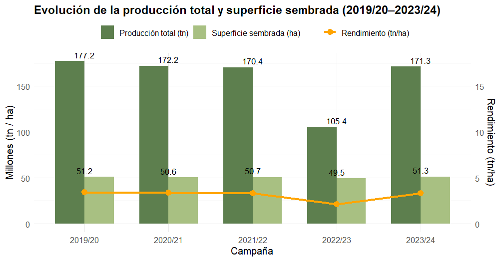 Fig. 3. Evolución de la producción total y superficie sembrada para las campañas 2019 a 2024. Elaboración propia en base a datos del Ministerio de Economía.